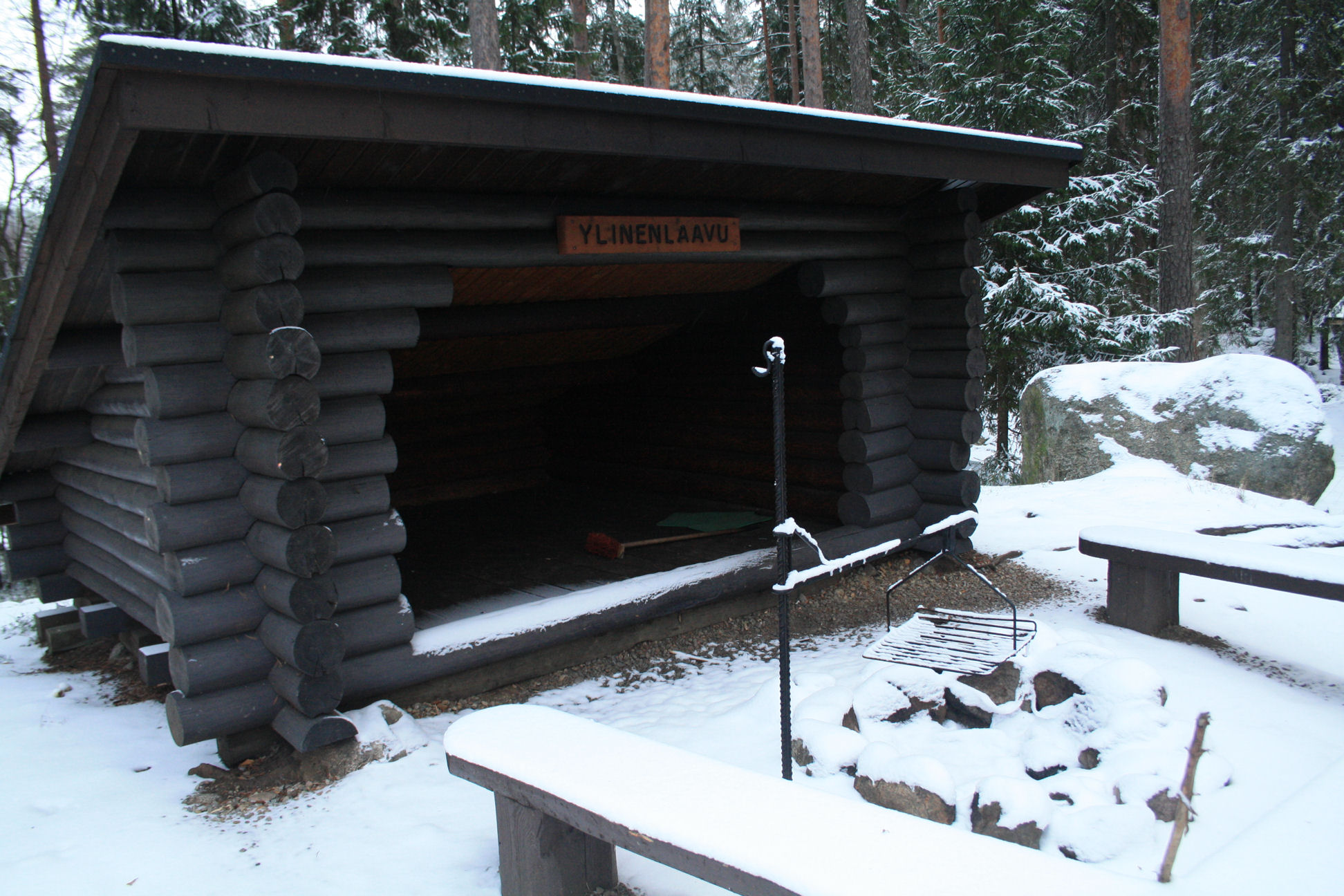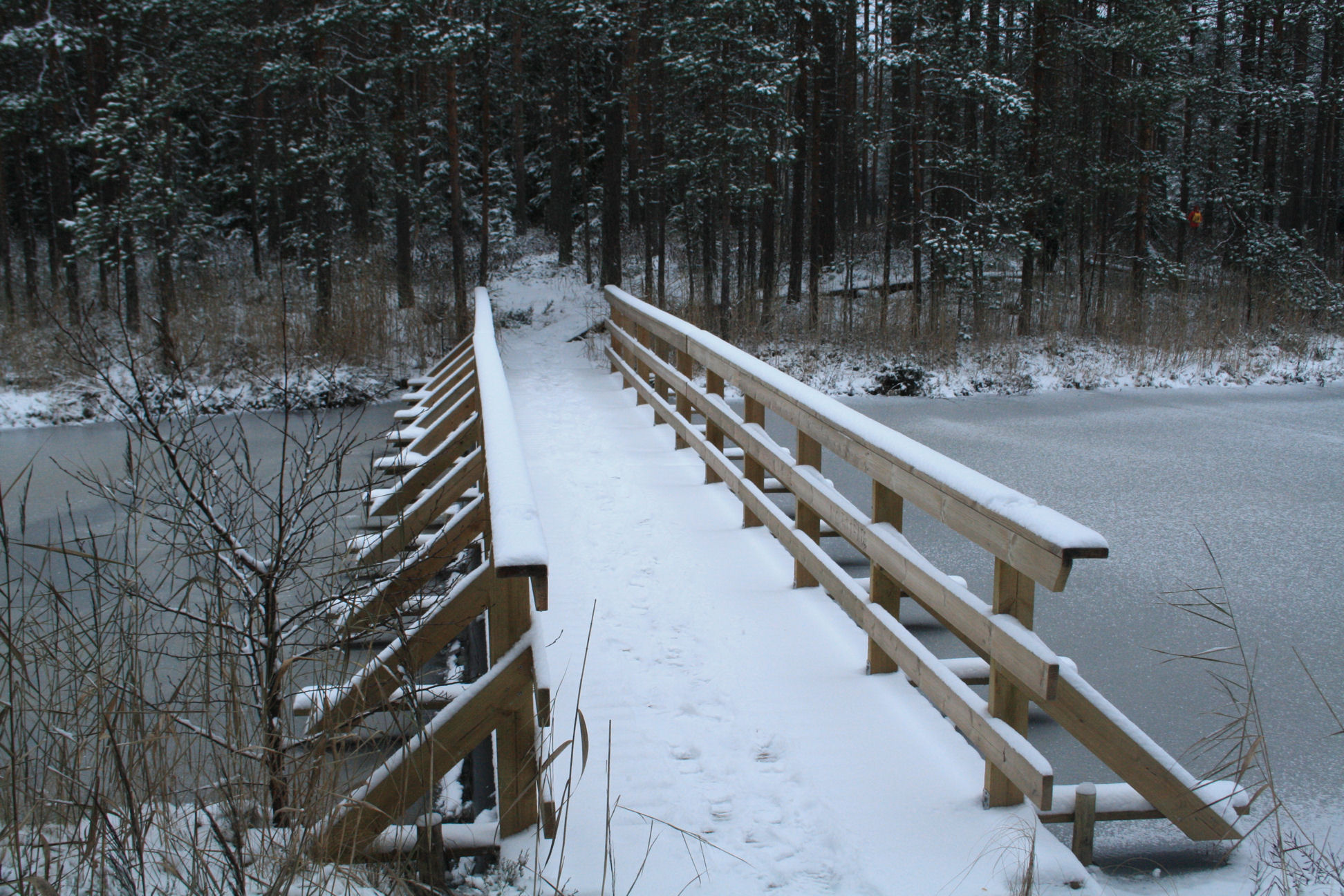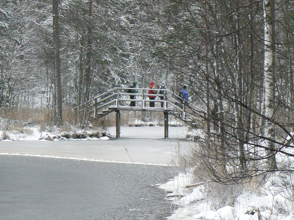 Koukkujärven kiertäville pitkospuille. Järven itärannalla oli pieni laavu,