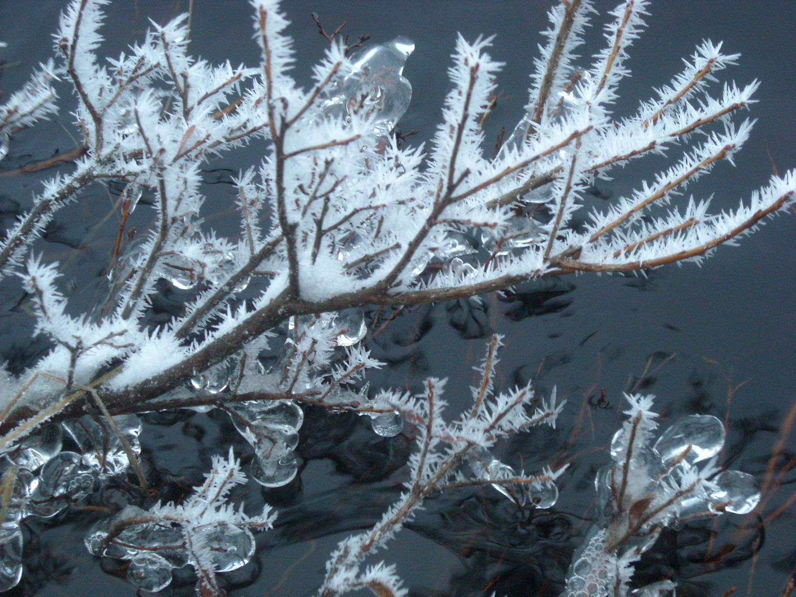 Talventulo oli tehnyt omaa taidettaan kuuraisiin varpuihin, mitkä peilautuivat