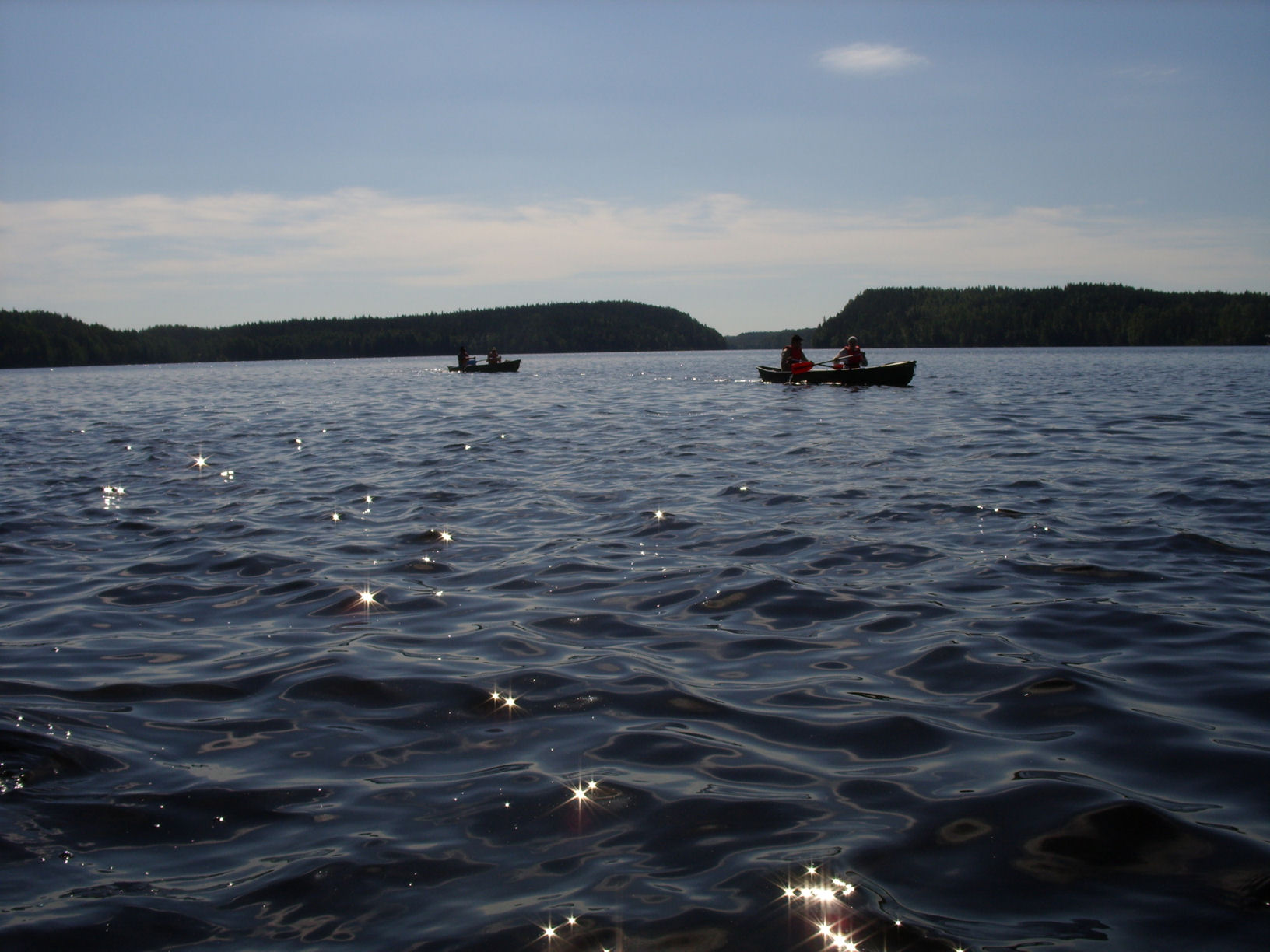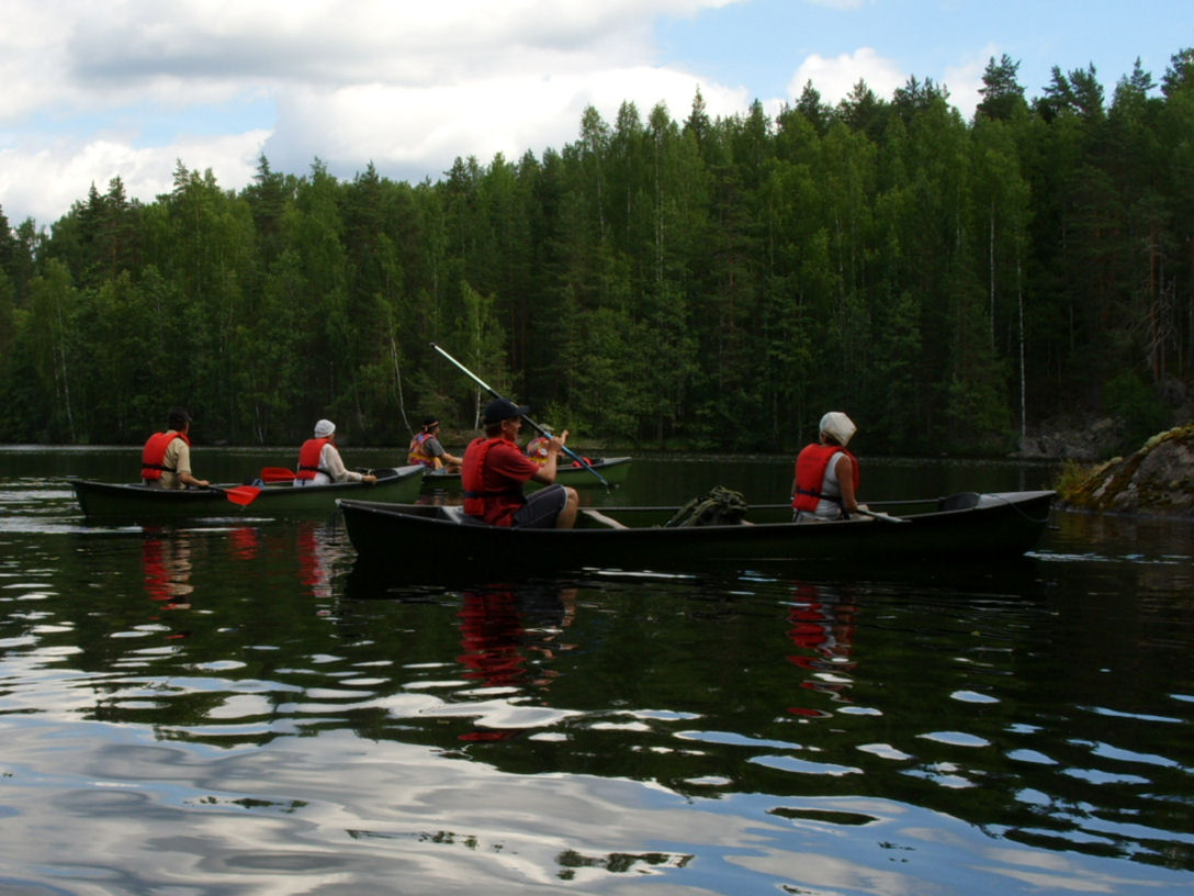 Viisi kanoottikuntaa aloitti melontaretken lauantaina 10.7.2010 Vuolenkoskella Haapalahden rannasta kohti Laukkaavan Hirven kalliomaalausta. Osa kanooteista oli omia, loput saimme vuokrattua kuljetuksineen Pauli Komppulalta. Osa meistä melojista oli ensikertalaisia, mutta pienten alkuvaikeuksien jälkeen liikkuminen alkoi sujua. Maasaaren ohitettuamme saavutimme merkityn venereitin, millä silloin oli melko vilkasta johtuen Vuolenkosken kesätorista. Haukkaselän saavutettuamme Kymijoki kääntyi kohti länttä, mutta me jatkoimme pohjoiseen kohti Haukkavuoren pystyjyrkkää veteen ulottuvaa kalliota, mistä pienen etsiskelyn jälkeen löysimme hirviaiheisen kalliomaalauksen. Harri onnistui bongaamaan samalla Laukkaava Hirvi-geokätkön, joten siltäkin saralta tuli yksi kohde lisää. Melonta jatkui kapean salmen läpi kohti Heinolan rajaa Ruukittomanlahdelle, mikä 2,5 km pitkänä ulottuu kauas pohjoiseen Kelloniemen itäpuolella. Maisemaltaan paikka muistuttaa paljolti Kuusamon maisemia. Rantauduttuamme pienelle kallioniemekkeelle pidimme kunnon evästelytauon trangia-kahveineen. Paluu tapahtui suunnilleen samaa reittiä takaisin, paitsi pari kanoottikuntaa kävi vielä vilkaisemassa Rautakannanvuoren maalauksia. Eija oli kännyköinnyt siskolleen Maasaareen ja tilannut uintimahdollisuuden heidän mökkinsä laiturilta. Porukalla autoimme samalla heidän veneensä talviteloilta rantaan. Tästä vielä noin kilometrin melonnan jälkeen olimme takaisin Haapalahdessa jokainen lievästi punoittaen, sillä suoraan taivaalta porottanut aurinko, veden kimmellys ja reilu 20 asteen lämpö olivat tehneet tehtävänsä.